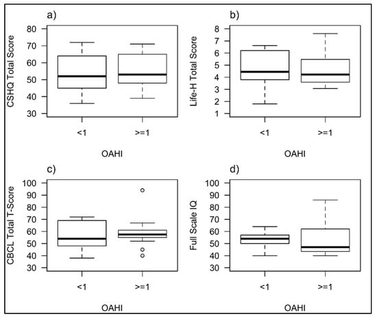 A sub-group analysis was undertaken in those children who underwent PSG (n = 36), grouping children by OAHI into those with OSA (OAHI > 1/h) and those without (OAHI ≤ 1/h). A Mann–Whitney test was undertaken to compare participants and demonstrated no significant difference in sleep behaviour (U = 161, p = 0.835), functional ability (U = 131, p = 0.769), general behaviour (U = 175, p = 0.511) and IQ scores (U = 65, p = 0.718) between children with OSA and those without (Figure 3).