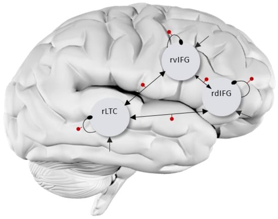 RH DCM full model. Driving inputs (C matrix) are marked by straight arrows into each VOI. Intrinsic self-connections are marked by curved round-end lines. Extrinsic (between-regions) connections are marked by straight arrows between regions. All connections were switched on in both A (all arrows) and B matrices (arrows with red dot) for both phonological and semantic tasks. The bilateral model was similar, with mirror architecture in the left hemisphere, as well as three homotopic connections between hemispheres switched on in A and B matrices.
