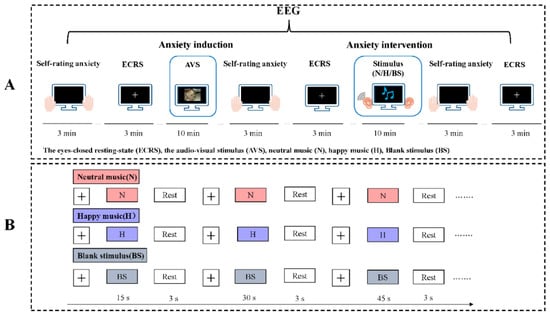 (A) Experimental paradigm. The experimental session had two phases: anxiety induction and anxiety intervention. Self-rated anxiety scores by scales and eyes-closed resting-state (ECRS) EEG signals were acquired before and after the two phases. In the anxiety induction phase, we used 100 negative target pictures (IAPS) and short standardized film fragments as audio-visual stimuli (AVSs) to evoke anxiety. In the anxiety intervention phase, the participants in each group received three interventions (neutral music stimulus, happy music stimulus and blank stimulus) after anxiety induction. (B) The anxiety intervention phase included the neutral music group, happy music group and blank stimulus group. The durations of the three interventions were 15 s, 30 s and 45 s, respectively. We selected six pieces of the same type of music and repeated the procedure six times with an interval of 3 s. The intervention lasted for 10 min in total. We set the volume for all the subjects at 50 decibels, but the subjects were allowed to adjust the volume if they found it to be too low or too high.