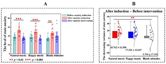 The effects of anxiety induction and the anxiety intervention. (A) Analysis of variance among before anxiety induction, after anxiety induction and after anxiety intervention in state anxiety scores. The level of state anxiety of three groups in after anxiety intervention are significantly higher than before anxiety induction. After anxiety intervention, neutral music group and happy music group were significantly lower than after anxiety induction. Notably, no significant difference between after anxiety induction and after anxiety intervention under blank stimulus. (B) The decreasing variance of state anxiety. After the anxiety intervention, compared with the decreasing variance of state anxiety in the blank stimulus group, the neutral music and happy music both showed the greater effect, but there was no significant difference between neutral music group and happy music group (after anxiety induction—after anxiety intervention).