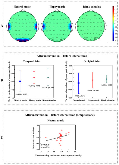 (A) Power spectrum differences before the anxiety intervention and after the anxiety intervention in the temporal lobe and occipital lobe in the gamma band (after anxiety intervention—before anxiety intervention). Blue represents reduced spectral power density. (B) The decreasing variance of power spectral density. There were no significant differences in the variance of power spectral density among the neutral music group, happy music group and blank stimulus group (after anxiety intervention—before anxiety intervention). (C) Correlation analyses between state anxiety and the power spectrum. Positive correlations were identified between state anxiety scores and power spectral density in the occipital lobe in the gamma band under the neutral music condition (after anxiety intervention—before anxiety intervention).