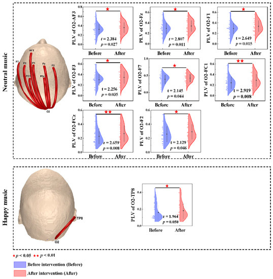 The occipital lobe was demonstrated to be a significant predictor of the effect of the anxiety music intervention based on the results presented in the previous section. Hence, the occipital cortex emerged as the preferred region, and phase-locking values between the occipital lobe and the remaining brain regions were computed. The phase-locking value contrast (before anxiety intervention < after anxiety intervention) based on the paired t-test and Wilcoxon nonparametric t-test revealed increased brain functional connectivity after listening to neutral music at the O2-AF3 (t = 2.384, p = 0.027), O2-Fz (t = 2.807, p = 0.011), O2-F1 (t = 2.649, p = 0.015), O2-F3 (t = 2.256, p = 0.035), O2-F7 (t = 2.145, p = 0.044), O2-FC1 (t = 2.919, p = 0.008), O2-FCz (z = 2.659 p = 0.008) and O2-F2 (t = 2.129, p = 0.046) channels in the gamma band. The phase-locking value in the happy music group based on the Wilcoxon nonparametric t-test revealed increased brain functional connectivity at the O2-TP8 (z = 1.964, p = 0.050) channel in the gamma band (Figure 4).