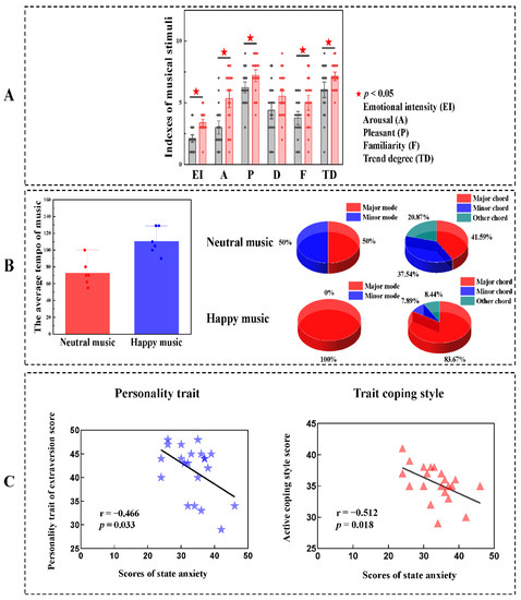 The scores of the indexes of emotional intensity (EI, z = −3.887, p < 0.001), arousal (A, z = −3.209, p = 0.001), pleasantness (P, z = −2.142, p = 0.032), familiarity (F, t = −2.280, p = 0.028) and trend degree (TD, t = −2.297, p = 0.028) in the neutral music group were significantly lower than those in the happy music group. No significant difference in dominance was observed between the two groups (Figure 5A). The average tempo of neutral music ranged from 55 to 100 bpm (M ± SD = 72.833 ± 15.753), which was lower than that of happy music, which ranged from 90 to 129 bpm (M ± SD = 11.500 ± 15.783). For neutral music, major mode accounted for 50% of the musical sequence, minor mode accounted for 50% of the musical sequence, major chord accounted for 41.59% of the musical sequence, minor chord accounted for 37.54% of the musical sequence and other chord accounted for 20.87% of the musical sequence. For happy music, major mode accounted for 100% of the musical sequence, major chord accounted for 83.67% of the musical sequence, minor chord accounted for 7.89% of the musical sequence and other chord accounted for 8.44% of the musical sequence (Figure 5B). Considering individual differences, we also correlated trait personality and trait coping style with state anxiety after listening to neutral music. The state anxiety scores were significantly negatively correlated with the personality trait extraversion (r = −0.466, p = 0.033) and an active coping style (r = −0.512, p = 0.018) in the neutral music group (Figure 5C).