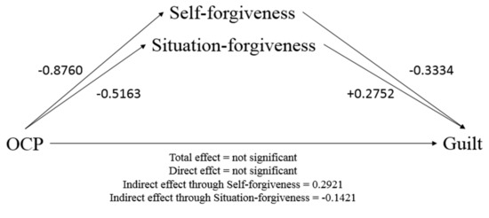 Mediational analysis tested the model in which OCP was inserted as the IV and guilt as the DV; self-forgiveness and situation-forgiveness were settled as putative mediators, revealing that OCP does not exert significant direct and total effects on guilt levels, but rather has an indirect effect through the occurrence of both self-forgiveness and situation-forgiveness (Table 3). A suppression effect [79] was probably revealed: namely, a non-significant total effect of the IV on the DV due to the opposite in sign direct and indirect effects of the IV on the DV. Specifically, higher OCP led both self- and situation-forgiveness to decrease, which in turn led guilt levels to increase (self-forgiveness) and to decrease (situation-forgiveness). This resulted in a positive indirect effect exerted by self-forgiveness, by increasing guilt, and a negative indirect effect through situation-forgiveness, by decreasing guilt (Figure 1).