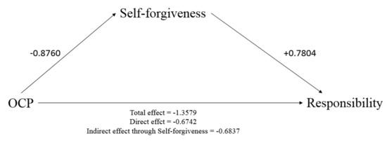 Two further mediational analyses were conducted to test mediation models in which the effect of OCP or CP on responsibility was mediated by self-forgiveness. The first analysis revealed that higher OCP led responsibility levels to increase both directly and indirectly through self-forgiveness. That is, higher OCP levels led self-forgiveness to decrease, which in turn led responsibility scores to decrease: the multiplication of these effects gave a positive indirect effect such that higher OCP levels led responsibility to increase through the mediation of self-forgiveness (Table 5 and Figure 2).