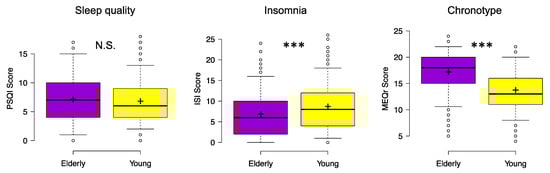 Sleep quality (PSQI), severity of insomnia symptoms (ISI), and inclination to Morningness–Eveningness (MEQr) for elderly and young respondents during the COVID-19 lockdown. Center lines show the medians; box limits indicate the 25th and 75th percentiles; whiskers extend to 5th and 95th percentiles, dots represent outliers; crosses represent sample means. Significant differences of Kruskal–Wallis test between elderly (violet) and young (yellow) participants are indicated with asterisks (*** p < 0.001). Abbreviations: PSQI, Pittsburgh Sleep Quality Index; ISI, Insomnia Severity Index; MEQr, Morningness–Eveningness Questionnaire-reduced version; N.S., not significant.