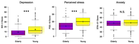 Depression symptoms (BDI-II), perceived stress (PSS-10), and anxiety (STAI-X1) for elderly and young respondents during the COVID-19 lockdown. Center lines show the medians; box limits indicate the 25th and 75th percentiles; whiskers extend to 5th and 95th percentiles, dots represent outliers; crosses represent sample means. Significant differences of Kruskal-Wallis test between elderly (violet) and young (yellow) participants are indicated with asterisks (*** p < 0.001). Abbreviations: BDI-II, Beck Depression Inventory-second edition, PSS-10, Perceived Stress Scale-10; STAI-X1, state-anxiety subscale of the State-Trait Anxiety Inventory; N.S., not significant.