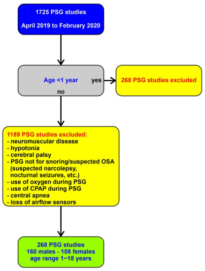 In total, 268 pediatric polysomnograms were included in this study. The children’s mean age was 8.7 years (4.68 SD), the range was 1−18 years, 160 were male, and 108 were female.