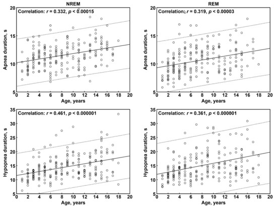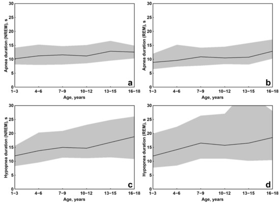 Breathing is an essential function that requires both metabolic and behavioral control during wakefulness but depends on metabolic control during sleep. Breathing also depends on the maturity of the neural centers and the strength of the respiratory muscles. In patients with sleep disordered breathing, breathing after an apneic event results from the interaction between chemoreceptors relaying information to brainstem neurons responsible for generating breathing patterns and influencing respiratory motor neurons controlling the airway muscles; both of these mechanisms are also affected by sleep stage physiology [1]. With sleep onset, muscle tone and minute ventilation are reduced with a subsequent increase in upper airway resistance [2]. REM sleep further decreases tidal volume and protective airway reflexes [3]. In obstructive sleep apnea, the obstructive event termination usually occurs simultaneously with an arousal, triggered by hypoxia, hypercapnia, and the presence of an occluded airway [4]. Obstructive sleep apnea syndrome (OSAS) is a sleep breathing disorder characterized by repeated episodes of partial or complete upper airway obstruction during the night [5]. This obstruction usually manifests itself with a reduction (hypopnea) or complete cessation (apnea) of the air flow in the upper airways with intermittent hypoxia and an oxidative imbalance, with increased production of reactive oxygen species, tumor necrosis factors, cytokines inflammatory diseases (IL2, IL4, IL6), lipid peroxidation, and cell-free DNA [6]. An obstructive apnea or hypopnea typically ends when an upper airway obstruction triggers a reflex stimulation of respiratory effort by the diaphragm, intercostal, and abdominal muscles, which generates enough pressure to produce an arousal or a gasp, resulting in airway opening and post apnea hyperpnea [7]. Normal children with normal muscle strength should be able to generate this increased intrathoracic pressure in a somewhat predictable manner. The literature, however, lacks information regarding the amount of time that children require to terminate an obstructive event. There is also a lack of understanding about the relation of apnea length to various comorbidities, such as neuromuscular conditions. We also do not know if the response to apnea varies with age. The American Academy of Sleep Medicine (AASM) scoring manual [8] recommends scoring pediatric obstructive events based on a two-breath rule. To score a pediatric obstructive apnea, there must be a drop in respiratory signal excursion of at least 90% for at least the duration of two breaths during baseline breathing. To score a pediatric hypopnea, the drop in signal excursion needs to be at least 30% for the duration of two breaths. As respiratory rate decreases from birth to puberty, the duration of each breath becomes longer. In obstructive sleep apnea, there must be evidence of respiratory effort. The AASM scoring manual states that after 13 years of age, it is up to the discretion of the sleep physician to score the studies using the adult criteria, which differs from pediatric criteria. For adults, obstructive apneas or hypopneas must be scored if they last for a minimum of 10 s. The duration of obstructive sleep apneas and hypopneas as a continuum over the different ages of children and adolescents, however, has not been previously reported.