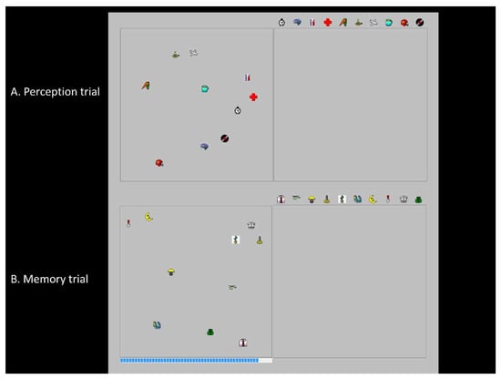 Participants were comfortably seated in a quiet room in front of a touchscreen monitor (19 inch) at a distance of ±60 cm. Data from the experiment were collected by registering touch presses on the monitor. The OLMT [47] consisted of four trials of which two were practice trials. The perception trial was to measure perceptual abilities, to control for possible perceptual impairments. Two 14.5 × 14.5 cm squares were shown on a touchscreen monitor, with ten randomly placed objects in the left square. Each participant was given the following instruction: “You will see two square frames, with the left containing ten objects. On the right there is an empty square with ten identical objects on top. You have to reconstruct the object array in the right frame, making sure the positions match those in the left frame”. For the memory trial, one 14.5 cm square was shown for 30 s with ten different objects. Participants were given the following instruction: “You will see a square containing objects for 30 s. You have to remember the locations of these objects as accurately as possible. After the object disappear, you will see an empty square, and you have to relocate the objects to the correct locations”. For the OLMT, absolute error rates and best-fit scores were calculated. The absolute error is the mean absolute distance in millimeters between the original and the relocated positions of the objects. For the best-fit score, all possible configurations between the original and the relocated positions were computed and the fit that had the smallest error rate was considered to be the best-fitting configuration [47]. In Figure 1, the perception and memory trial of the OLMT can be seen.