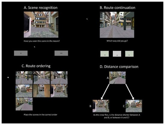 The VT test [12] consisted of a study phase with a walking route in a virtual environment and four tests: scene recognition, route continuation, route ordering and distance comparison. Scene recognition was tested with twelve static images of which six were taken from the study phase movie, and six distractors. Route continuation involved six images from six crossing points on the route, where participants had to judge the direction the route continued in (left, straight, right). For route ordering, six images taken from the study phase movie had to be placed in the correct order. For the distance comparison test, participants had to judge the absolute distance between two pairs of images taken from the route and decide which distance is the shortest. For scene recognition, route continuation and distance comparison trials of the VT test, the number of correct answers was registered. For the route ordering trial, a temporal order score was calculated, where points were awarded when the temporal location of an item was higher than the direct antecedent of the item in the reconstructed order (n − 1). In total, the OLMT and VT test took 20 min to complete. In Figure 2, examples of the VT tasks can be seen.