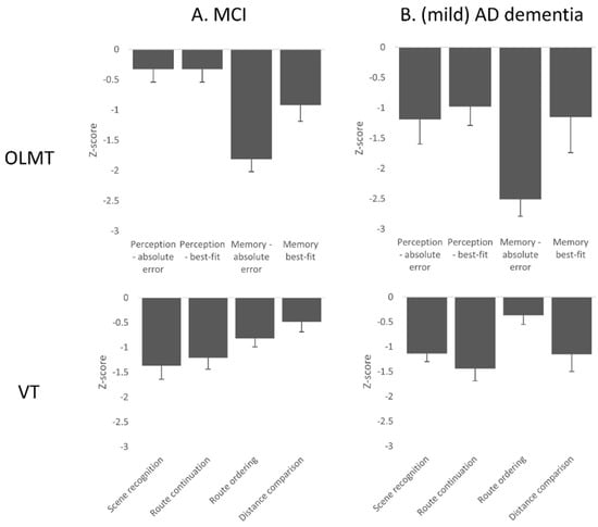 Bar plot of the means and standard errors on the OLMT and VT tasks for (A) patients with MCI, and (B) patients with mild AD dementia. Abbreviations: MCI = Mild Cognitive Impairment; AD = Alzheimer’s Disease.