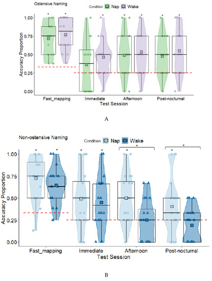 Box and Violin Plots for Accuracy During Fast Mapping, and Immediate, Afternoon, and Post-nocturnal Retention Tests for the Ostensive (A) and Non-ostensive Naming Groups ((B) from Axelsson et al. [46] presented here for comparison)(Squares Denote Means; Red Dashed Lines Denote Chance Level, * = p < 0.05).