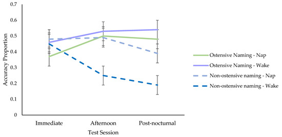 Ostensive Naming Group. Using stepwise forward selection, each variable was added to the linear mixed models (see Supplementary Materials Table S2 for the full list of models). There was no overall main effect of condition (nap, wake), but when test session (immediate, afternoon, post-nocturnal) was entered with polynomial contrasts, there was a significant quadratic trend (see Tables S2 and S3 in Supplementary Materials for the parameter estimates) indicating that retention increased from immediate to afternoon testing, which levelled off overnight to post-nocturnal testing (see Figure 5). The interaction between condition and test session was non-significant, suggesting that the change in retention scores between the nap and wake conditions did not differ significantly (see Tables S2 and S3).