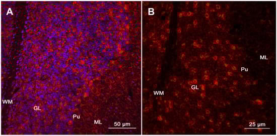 Detection of specific autoantibodies using tissue-based immunofluorescence. (A). Immunoreactivity of a patient’s CSF with sagittal mouse brain sections is demonstrated via TIF (Cerebellum, magnification: 100×, counterstaining of nuclei by Hoechst 33342 at 1:10,000). (B). Patient’s antibodies show a prominent immunolabeling of the neuropil of the granular layer (GL), whereas binding to the white matter (WM), Purkinje cell layer (Pu), and the molecular layer (ML) is less evident (magnification: 400×). This staining pattern is specific for neurexin-3alpha-antibodies and has been described in the first report of neurexin-3alpha-antibody associated autoimmune encephalitis [108]. Presence of antibodies targeting neurexin-3alpha (a synaptic protein) in patient’s CSF was subsequently confirmed via CBA (Figure adapted from Loehrer et al. [109], reproduced with permission from John Wiley and Sons).