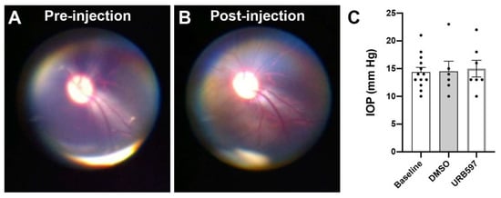 Fundus observation and assessment of intraocular pressure (IOP) with individual values. No differences in the fundus of the eyes before (A) or after a typical intravitreal injection (B). IOP values did not differ at baseline (before intravitreal injections), post-DMSO injection or post-URB597 injections (C). Error bars represent standard error of the means (SEM).