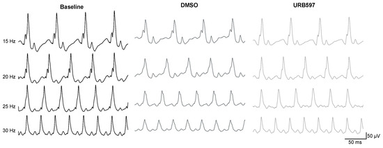 Methodological considerations. Under light adapted conditions (30 cd/m2 for approximately 2 min), 30 Hz flicker ERGs selectively reflect cone activity, given that the rod system does not respond at this rate [18]. However, a typical frequency–response curve includes a mixed rod-cone response at the peak (15 Hz) vs. a pure cone response at 30 Hz. It would have been interesting to measure the effects of URB597 in pure scotopic conditions to rule out its implication in night vision. We found that our pre-injection baseline was higher than both DMSO or URB597 injections. DMSO by itself is known to have an acute effect on the ERG (0–60 min post-injection) [52], and further studies might be warranted to measure the time course of URB597 effects. Finally, by using URB597, we cannot exclude other actions played by fatty acid primary amides, N-acyltaurines, N-acylglycines, and 2-AG acting upon PPARalpha, GPR119, TRPV1, and CB2R [53].