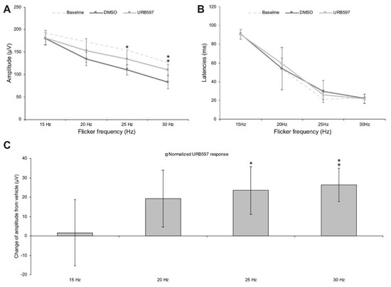 Frequency/response relationship of the flicker ERG following intravitreal administration of URB597. Peaks in amplitude values were observed at 15 Hz and then slowly decreased at 30 Hz. URB597 was significantly higher than DMSO at 30 Hz (A). Implicit times decreased with increasing frequency values. No differences were seen in vehicle (DMSO solution) and URB597 injected eyes (B). Data was averaged as DMSO (dark grey) and URB597 injection (light grey) monkeys. Dashed light grey lines represent the baseline response at all frequencies for amplitudes and latencies (A,B). Normalized URB597 amplitude responses (post-URB597 amplitude minus post-DMSO amplitude) is shown following URB597 intravitreal injection (C). URB597 was significantly different than DMSO at 30 Hz. * p < 0.05; ** p < 0.01. Error bars represent standard error of the means (SEM).