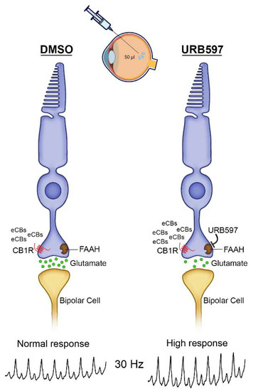 Overview of the putative mechanism of action of URB597 in the monkey retina. CB1R, cannabinoid receptor type 1; DMSO, dimethyl sulfoxide; eCBs, endocannabinoids; FAAH, fatty acid amide hydrolase (brown squares); glutamate (green filled circles); URB597.