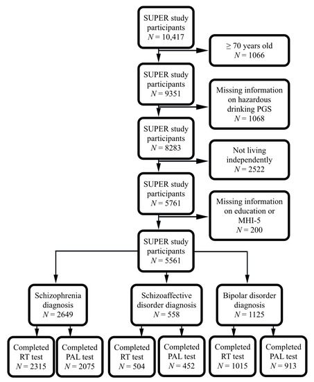 Out of the original 10,417 study participants, we included 2649 with a lifetime diagnosis of schizophrenia (1639 only schizophrenia, 101 schizophrenia + bipolar disorder, 664 schizophrenia + schizoaffective disorder, 245 schizophrenia + schizoaffective disorder + bipolar disorder), 558 with a lifetime diagnosis of schizoaffective disorder (299 only schizoaffective disorder, 259 schizoaffective + bipolar disorder) and 1730 with a lifetime diagnosis of only bipolar disorder (without schizophrenia or schizoaffective disorder), and excluded those aged 70 years and above, not living independently and with missing information on alcohol PGS, education or MHI-5. Considering the hierarchy of severity of illness, duel diagnosed participants were included in schizophrenia and schizoaffective disorder diagnosis groups. Among the schizophrenia diagnosis group, 2315 (1252 males, 1063 females) completed the Reaction Time (RT) test, and 2075 (1124 males, 951 females) completed the Paired Association Learning (PAL) test. Among the schizoaffective disorder diagnosis group, 504 (174 males, 330 females) completed the Reaction Time (RT) test, and 452 (159 males, 292 females) completed the Paired Association Learning (PAL) test. Among the bipolar disorder diagnosis group, 1015 (369 males, 646 females) completed the RT test, and 913 (322 males, 591 females) completed the PAL test. Among the combined study population group, 3850 (1799 males, 2051 females) completed the RT test, and 3440 (1605 males, 1835 females) completed the PAL test (Figure 1 and Supplementary Figure S1).