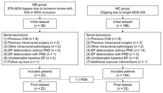 Flowchart of patient enrollment. MB, middle cerebral artery bypass surgery; MC, middle cerebral artery clipping surgery; STA, superficial temporal artery; MCA, middle cerebral artery; ICA, internal carotid artery; EP, evoked potential; PND, postoperative neurologic deficit; PSM, propensity score matching.