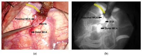 - Pandey, P.; Ambekar, S.; Babu, A.; Devi, I.B. Intraoperative assessment of STA-MCA bypass patency using near-infrared indocyanine green video-angiography: A preliminary study. Neurol. India 2012, 60, 604–607. [Google Scholar] [CrossRef]