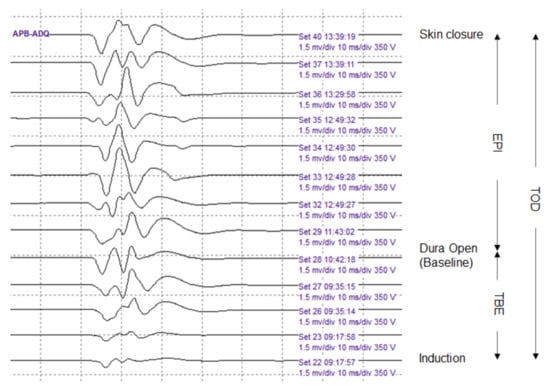 Serial abductor pollicis brevis motor evoked potentials (APB-MEPs) during the surgery. The APB-MEPs show a gradual increase in amplitude. We defined three time-related covariates. The time to baseline EP (TBE) was designated as the time from induction to baseline EP measurement. The EP interval (EPI) represented the time from baseline EP to final EP measurements. Finally, the total operation duration (TOD) was the time from induction to final EP measurement.