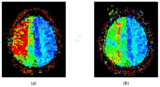 We used a 3.0-tesla whole-body magnetic resonance system (Ingenia 3.0T CXQ, Phillips, Eindhoven, Netherlands). PWI was performed using the following protocol: TR = 1300 ms; TE = 30 ms, flip angle = 30°, matrix = 128 × 128, field of view = 240 × 240 mm, number of signals averaged = 1, and slice thickness = 5 mm. Gadobutrol (Gadovist® 1.0, Bayer Schering Pharma, Berlin, Germany) was used as a contrast agent, and 10 mL was injected intravenously at a rate of 2.5 mL/s. Regions of interest (ROIs) were established in the bilateral centrum semiovale area. The same ROI location was selected for all measurements in each patient (Figure 4).