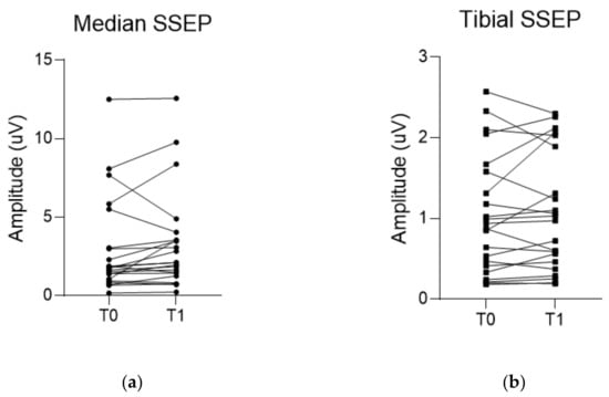 The median SSEP showed a slight increase in amplitude from 1.8 µV (1.0, 3.0) to 2.1 µV (1.4, 3.5), though it was not statistically significant (p = 0.051). Tibial SSEP showed little change from baseline amplitude of 0.9 µV (0.4, 1.6) to 1.0 µV (0.5, 1.9) to the final amplitude (p = 0.604). Meanwhile, the APB-MEP amplitude significantly increased from baseline 1318.9 ± 796.1 µV to the final value 1793.2 ± 856.0 µV (p = 0.010). Similarly, AH-MEP amplitude also significantly increased from a baseline of 1169.9 ± 576.2 µV to a final value of 1593.8 ± 721.6 µV (p < 0.001) (Table 3 and Figure 5).