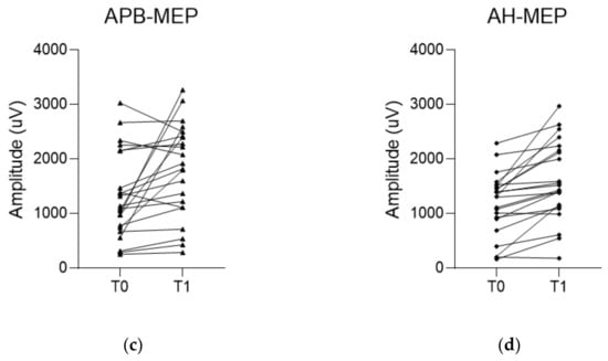Changes in amplitude of each evoked potential (EP) during the surgery. (a,b) Median and tibial somatosensory evoked potential (SSEP) do not show a significant increase in amplitudes between baseline and final values. On the other hand, (c,d) motor evoked potentials recorded in the abductor pollicis muscle (APB-MEP) and abductor hallucis muscle (AH-MEP) show a significant increase in their amplitudes between baseline and final values. T0 indicates the baseline EP. T1 indicates the final EP.