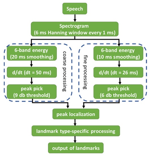 In this connection, conducting landmark-based acoustic analysis by using the software SpeechMark© ([33], Boston, MA, USA) might be preferrable. The acoustic analysis was developed based on the landmark-based theory proposed by Stevens [34,35,36,37,38], Liu [39] and Howitt [40]. In the analysis, letters representing different acoustic landmarks and the positive/negative symbols showing the onset/offset of the sounds are presented when certain types of abrupt changes in spectrum or amplitude are detected. The theory hypothesizes that listeners rely on those abrupt changes in input to distinguish and recognize the heard speech sounds. The acoustic specifications and the associated articulatory interpretations of the six consonantal landmarks are shown in Table 1. Please note that the descriptions from Table 1 were directly adopted from MacAuslan [41], Ishikawa, MacAuslan and Boyce [42], and Liu [30], because these acoustic rules for generating the landmarks were specified by the software developers, and, hence, the resulting articulatory interpretations were constant as well. Based on Liu [39] and Ishikawa and MacAuslan [43], the landmark detection algorithm is shown in Figure 1. In general, the speech input was transformed into a spectrogram and was further processed with coarse smoothing (for suppressing too-brief events) and fine smoothing (for promoting higher-precision placement). The peaks in the signal represented the abrupt changes in speech input and the output of landmarks were determined based on the acoustic rules (for abrupt changes) specified in Table 1. By using the software SpeechMark©, the resulting patterns of the consonantal landmarks shown in Table 1 could be available within a reasonable period of time. Additionally, the underlying speech motor deficits of the speakers could be identified based on the articulatory interpretations in Table 1.