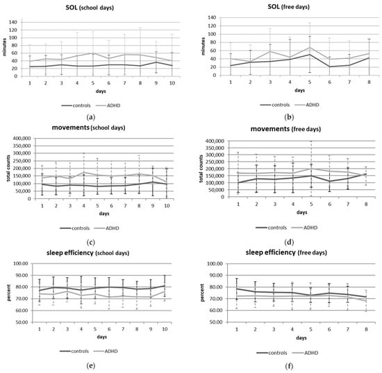 The descriptive statistics of the sleep variables are presented in Table 2. The median of the total wearing time for the actigraph was 14 days (range: 7–21 days) for children with ADHD and 15 days (range: 10–22 days) for the controls, and did not differ significantly between the groups. The number of school days (ADHD median: 9 days; controls median: 8 days) or free days (ADHD median: 6 days; controls median: 7 days) on which the actigraphs were worn also did not differ significantly between children with ADHD and controls. In-bed time and out-of-bed time were nearly the same in the two groups, regardless of the day of the week.