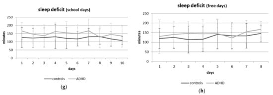 Group differences in sleep variables: Mixed effects models were fitted to the data, with each sleep variable separately as dependent variable, controlling only for IQ and sex as groups were age-matched (fixed factors: group, day of week, group x day of week). We found significant main effects of group for SOL (t (67) = 2.817, p = 0.006, partial η² = 0.11, Figure 1a,b), TC (t (59)= 2.718, p = 0.009, partial η² = 0.11, Figure 1c,d), and sleep efficiency (t (60) = −2.128, p = 0.037, partial η² = 0.07, see Figure 1e,f) with medium to large effect sizes. Furthermore, day of the week was a significant factor in TC (t (826) = 3.575, p < 0.011) and for sleep efficiency (t (831) = −2.554, p = 0.011). We observed trend level effects of group on sleep deficit (t (64) = 1.864, p = 0.067, see Figure 1g,h) and also a trend-level interaction of group x day of week on sleep deficit (t (829) = −1.927, p = 0.054). The results did not change substantially when age was included in mixed-effects models as a fixed factor, with the exception of sleep deficit (t (63) = 2.027, p = 0.047). Post hoc analyses with independent samples t-tests revealed that children with ADHD needed more time to fall asleep (20 min on school days: t (46) = −2.671, p = 0.010; 15 min on free days: t (55) = −2.317, p = 0.024) than typically developing children. Children without ADHD moved less during sleep than children with ADHD did, as assessed by TC, regardless of the day of the week (school days: t (46) = −3.346, p = 0.002; free days: t (55) = −2.598, p = 0.012). Moreover, sleep efficiency was lower in children with ADHD (minus 5%) regardless of the day of the week (school days: t (46) = 2.218, p = 0.032; free days: t (55) = 2.248, p = 0.029). The extent of the sleep deficit only differed between the groups on school days (t (46) = −2.135, p = 0.038), with ADHD children experiencing more sleep deficits on school days compared with typically developing children. No group differences emerged on free days (t (55) = −1.188, p = 0.240). Paired samples t-tests revealed that on free days, all children moved more during sleep (TC: t (47) = −3.757, p < 0.001) and had lower sleep efficiency (t (47) = 2.335, p = 0.024), but no differences in sleep deficit were found (t (47) = 1.089, p > 0.05). Only marginally significant effects were found regarding a group x day of week interaction effect on sleep deficit. Children with ADHD tend to experience a greater sleep deficit on school days compared with free days; whereas, children without ADHD tend to experience greater sleep deficit during free days. When only considering children with a sleep duration of less than 7 h [68], which is the minimum of the recommended sleep length for this age group (mean recommended 9–11 h [68]), 32% of children with ADHD fell below this cut-off on school days, whereas only 12% of control children did so. Similar differences emerged on free days, with 29% of children with ADHD and 6% of control children sleeping less than 7 h per night.