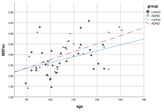 Independent samples t-tests revealed no differences in chronotype between groups (ADHD or control; t (54) = −1.481, p > 0.05), except from age effects (Figure 2). The SOT, which could also be a relevant marker for circadian timing, did not differ between ADHD and control children. Analyses with a mixed model only found main effects for day of the week (p < 0.001) and sex (p = 0.026). Post hoc analyses with paired-samples t-tests revealed that both ADHD and control children had a later SOT on free days than on school days (t (47) = −9.894, p < 0.001), with females falling asleep earlier than males (school days females/males: 8:53 p.m./9:33 p.m.; free days females/males: 9:46 p.m./10:21 p.m.).