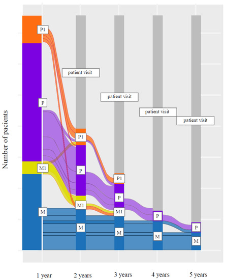 Treatment dynamics after 12 months of LCIG therapy up to patient visit. Note: treatment groups were followed up to patient visit, which may have occurred at different time points for each patient. The treatment duration was calculated from LCIG initiation up to patient visit. The grey vertical bars indicate patient visit moment. The type of treatment after the patient visit is not available, since the study did not include a prospective monitoring after the patient visit. M = LCIG monotherapy; M1 = LCIG + night therapy; P = LCIG + day add-on therapy; P1 = LCIG + day and night add-on therapy. LCIG = levodopa-carbidopa intestinal gel.