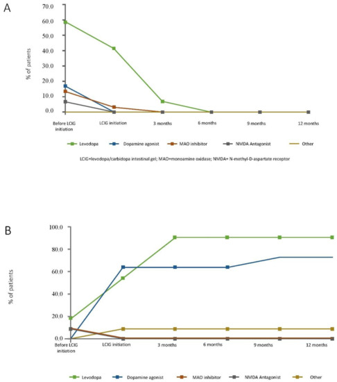 The percentage of patients from the monotherapy with night medication group (as it was defined at 12 months of LCIG treatment) using a MAO inhibitor or an NMDA inhibitor decreased over time in the first year after LCIG initiation, while the use of dopamine agonists and levodopa add-on therapy increased at LCIG initiation and at three months, respectively, and remained constant thereafter.