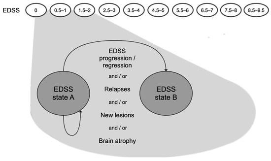 We construct a decision-analytic model as a Markov model in which the states and state transitions are based on disability progression as measured with the EDSS, similar to previous widely used model structures of disability progression in RRMS [,,]. In addition to these classical EDSS-based Markov models, the simulated patients can experience both clinical and subclinical disease activity, in the form of EDSS progression, relapses, new lesions, and/or brain atrophy; see Figure 1. The cycle duration is one year, which is the maximally recommended duration between neurological (including MRI) examinations for RRMS patients [].