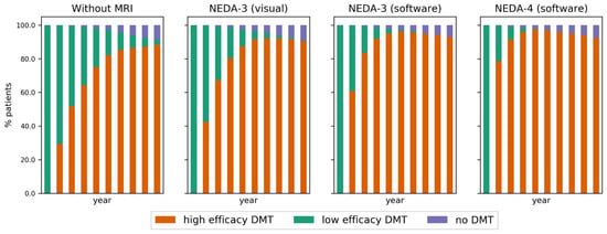 As a consequence of detecting more patients with active disease in the first cycles of the simulation, a faster escalation to high efficacy DMT occurs in the decision-making strategies assisted by MRI. This is illustrated in the DMT distribution per strategy in Figure 5. Note the difference in escalation speed between the strategies.