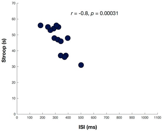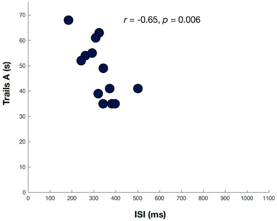 Neuropsychological assessment scaled scores for assessments associated with greater ISI prolongation are shown in Table 3. Greater ISI prolongation was associated with lower scores in the cognitive domains of processing speed, attention/working memory, and executive function. The Spearman correlation coefficient was significant when comparing the ISI and TMTA (r = −0.65, p = 0.006) (Figure 1), DSF (r = 0.57, p = −0.017), DSB (r= −0.55, p = 0.021), and DST (r = −0.74, p = 0.001)—all tests of attention/working memory. Lower scores on SCWT Interference, a marker of executive function, were also significantly associated with ISI prolongation (r = −0.8, p = 0.0003) (Figure 2). The WAIS-IV Coding score, a marker of processing speed, was significantly associated with ISI prolongation (r = 0.72, p = 0.0017). The remaining measures showed a trend toward association, though they were not significant.