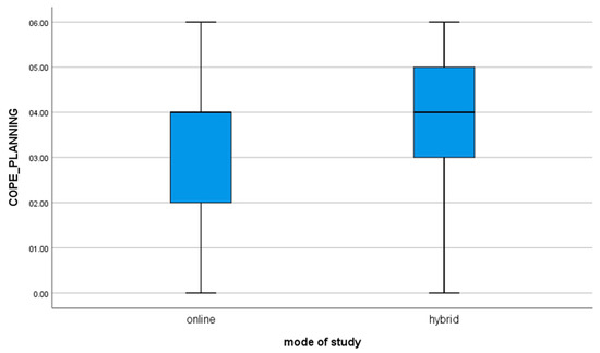 2. for the variable COPE_PLANNING, t(112) = −2.12; p = 0.036, the mean of the results in the group of students studying in the online mode is statistically significantly different from the results obtained by students studying in the hybrid mode (value of the mean difference: −0.55). The negative result shows that hybrid learners are significantly more likely to use self-planning strategies in stressful situations as compared to online learners (Figure 2).