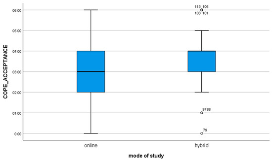 4. for the variable COPE_ACCEPTANCE, t(112) = −2.68; p = 0.009, the mean of the results in the group of students studying in the online mode is statistically significantly different from the results obtained by students studying in the hybrid mode (value of the mean difference: −0.62). The negative result shows that hybrid learners are significantly more likely to accept the situation by learning how to live in it as compared to online learners (Figure 3).