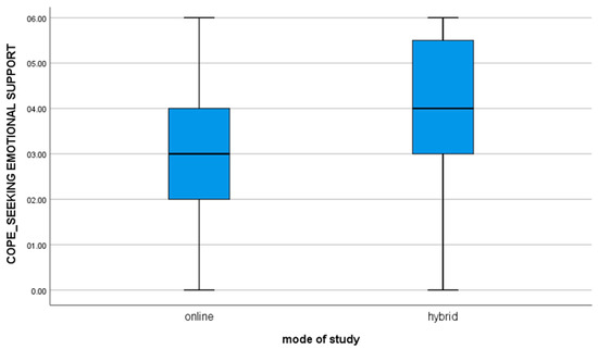 7. for the variable COPE_SEEKING EMOTIONAL SUPPORT, t(112) = −3.13; p = 0.002, the mean of the results in the group of students studying online is significantly different from the results obtained by students studying hybrid (value of mean difference: −0.86). The negative result shows that hybrid learners are significantly more likely to seek encouragement, understanding, and support from others as compared to online learners (Figure 4).
