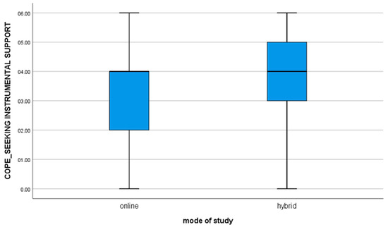 8. for the variable COPE_SEEKING INSTRUMENTAL SUPPORT, t(112) = −3.01; p = 0.003, the mean of the results in the group of students studying online is significantly different from the results obtained by students studying hybrid (value of mean difference: −0.84). The negative result shows that hybrid learners are significantly more likely to seek and receive advice and help from others as compared to online learners (Figure 5).