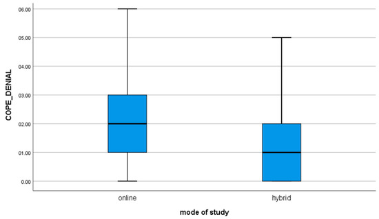 10. for the variable COPE_DENIAL, t(112) = 2.71; p = 0.008, the mean of the results in the group of students studying online is significantly different from the results obtained by the students studying hybrid (value of mean difference: 0.68). The positive result shows that online learners are significantly more likely to reject the fact of a situation compared to hybrid learners (Figure 6).