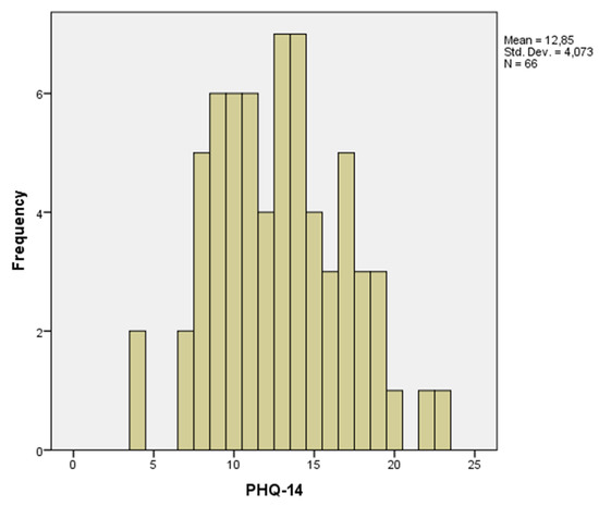 The analyzed population consisted of 66 IBS patients (31 low somatization (n = 13/18; M/F) and 35 high somatization (n = 5/30; M/F)) and 31 HCs (n = 11/20; M/F). The distribution of PHQ-14 in the IBS cohort can be seen in Figure 1.