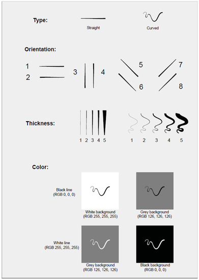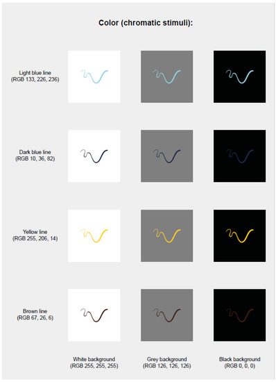 The line segments, one straight and one curved line with four different orientations and five levels of thicknesses, were presented in four chromatic colours (light blue, dark blue, yellow, and brown) on three achromatic backgrounds (white, black, and grey) for a total of 480 combinations (presented in random order).