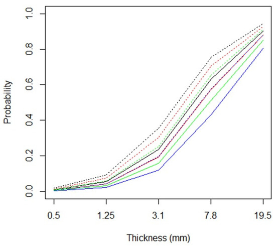 When all these variables were considered together in a multivariate logistic regression including the random effects of participants, only orientation was not significantly associated with the response variable. The results of these analyses are shown in Figure 3. The most evident effect is the higher probability of seeing a surface when the thickness increases.