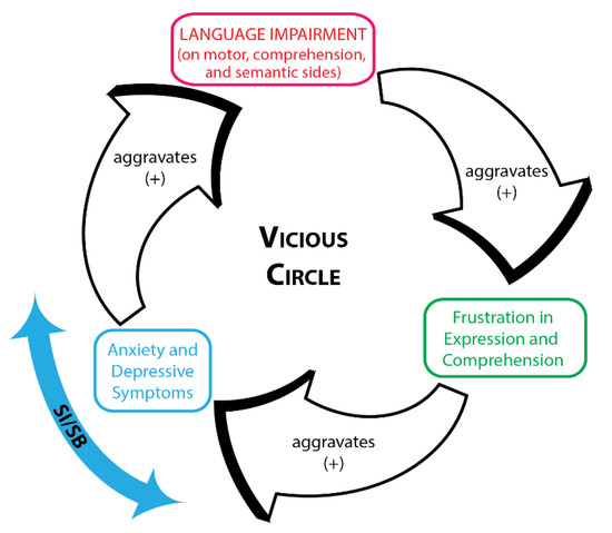 Collectively, the findings derived from the case described and the mini-review seem to support our hypothesis of a vicious circle, in which language impairments can exacerbate psychiatric comorbidities, in turn aggravating language impairments and turning affected individuals into what could be termed “desperate mutes”, i.e., creating conditions for the development of SI/SB (Figure 1).