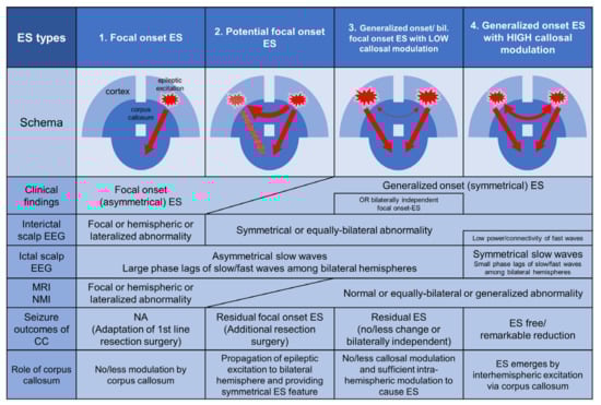 In Figure 1, we present four pattern types in relation to cortical excitation and the role of the corpus callosum, and we describe the characteristics of the role of the corpus callosum, clinical features, neuroimaging, EEG, and surgical strategy based on previous knowledge and experience. Focal onset ES (type 1) is caused predominantly by unilateral cortices and tends to show a uniformly lateralized seizure type. These emerge with little or no contribution from the corpus callosum. Unilateral epileptogenic lesions on MRI or hypometabolic areas of nuclear medicine imaging are often detectable. The region or side involved in interictal EEG discharges tends to be concordant with lesions on brain imaging. Resection surgery can be performed based on presurgical evaluations. Potential focal onset ES (type 2) originates from the unilateral hemisphere; however, it is clinically not lateralized due to the rapid propagation of epileptic activity via the corpus callosum. The epileptogenic hemisphere is relatively difficult to identify using presurgical evaluations, which do not clearly show localized/lateralized or discordant localization/lateralization among the studies, and which only became apparent after CC. Additional resection surgery is sometimes performed in the newly evident epileptogenic region. There are two types of generalized onset ES in which epileptogenic cortices are equally distributed in bilateral hemispheres. However, the role of the corpus callosum in the emergence of ES differs between these types. In generalized onset ES or bilaterally independent focal onset (asymmetrical) ES with low callosal modulation (type 3), intrahemispheric modulations in each hemisphere predominates in the emergence of the ES. CC cannot prevent the emergence of ES. However, in generalized onset ES with high callosal modulation (type 4), interhemispheric modulation among the bilateral hemispheres via the corpus callosum predominates in the emergence of the ES, and CC can achieve seizure freedom without additional resection. In these cases, ictal EEG is visually bilateral and synchronous on slow waves [10]. Computed frequency analyses of presurgical scalp EEG recordings have shown small phase lags of ictal slow and beta waves among the bilateral hemispheres and less power and connectivity on interictal records [8,11].