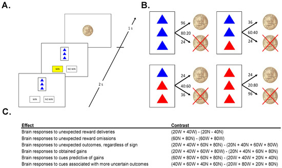 In order to investigate processes involved in the expectation and receipt or omission of monetary rewards, we administered a passive task designed to evoke PEs, in conjunction with functional magnetic resonance imaging (fMRI; see Figure 1A). Participants were given the following instructions: